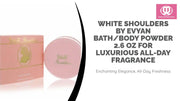 Stichworte: (cologne, absorbs moisture, all-day fragrance, body powder, elegant packaging, fragrance), luxurious body care, perfume, reduces friction, refreshing sensation, softens skin, versatile use, White Shoulders by Evyan Bath/Body Powder 2.6 oz for Luxurious All-Day Fragrance