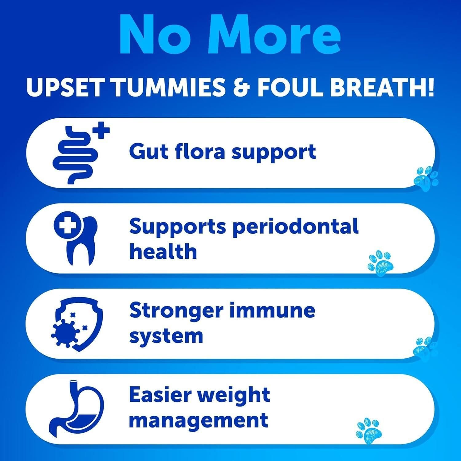 4.gut health support: chews help with bad breath & bowel health. our chewable treats help with no poop eating for dogs & aid with digestion, so your pup stays happy & healthy.